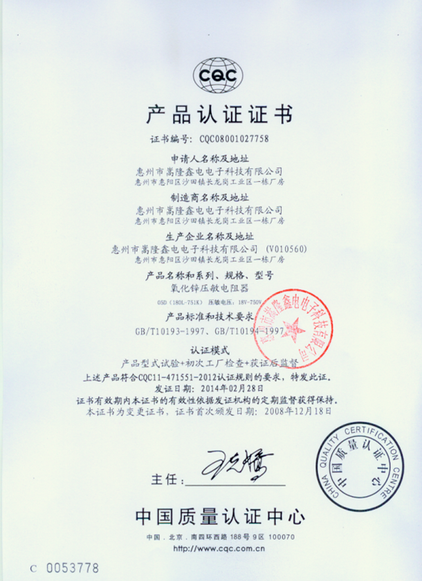 压敏电阻14D安全认证标准及证书号